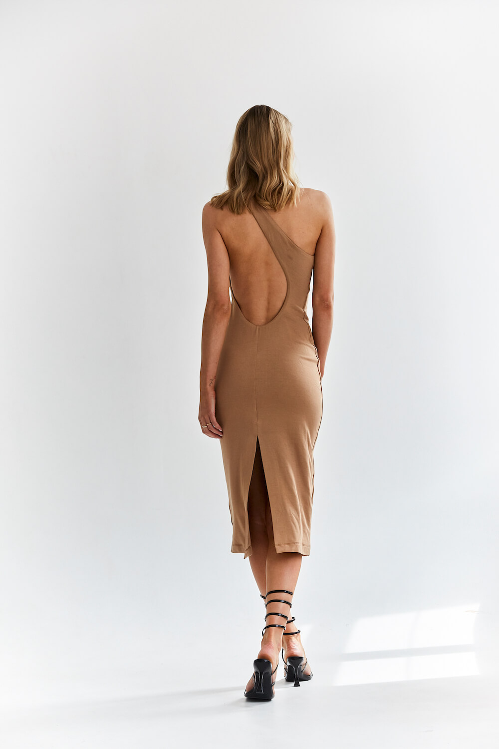 Beautiful, feminine, evening dress made of sweater knit in beige color. Classic one-sleeve model. The dress with an asymmetrical cutout on the back beautifully exposes the back. The dress has an opening at the back.