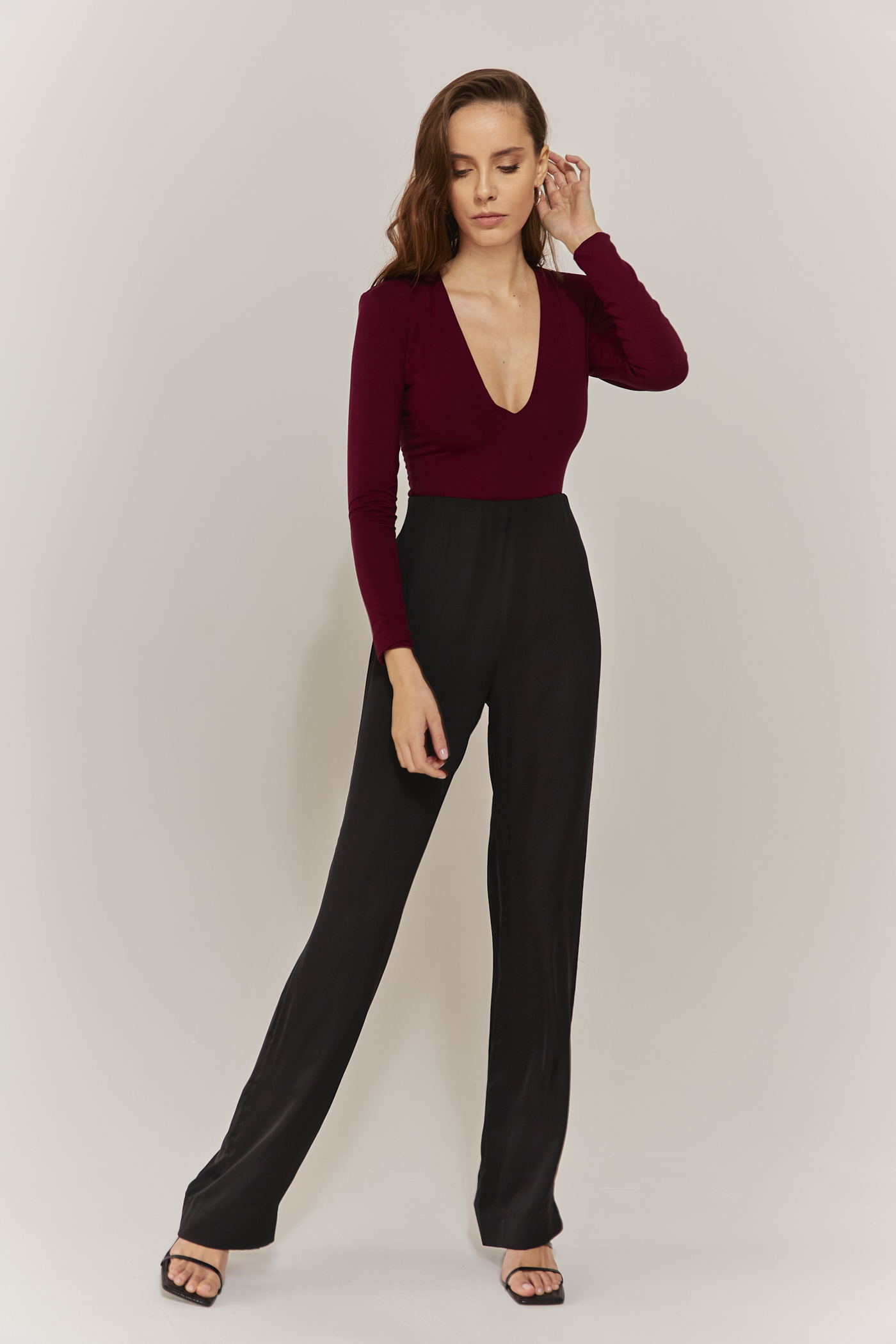 Długie, damskie, satynowe spodnie z wysokim stanem. Spodnie posiadają w pasie gumę obszytą materiałem oraz wewnętrzne lamowanie satyną. Spodnie satynowe zapinane na kryty zamek.