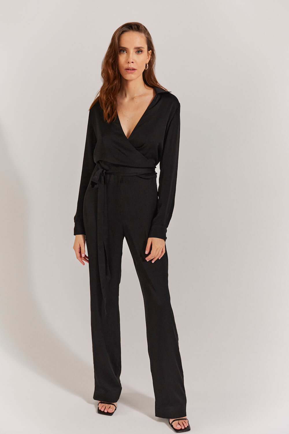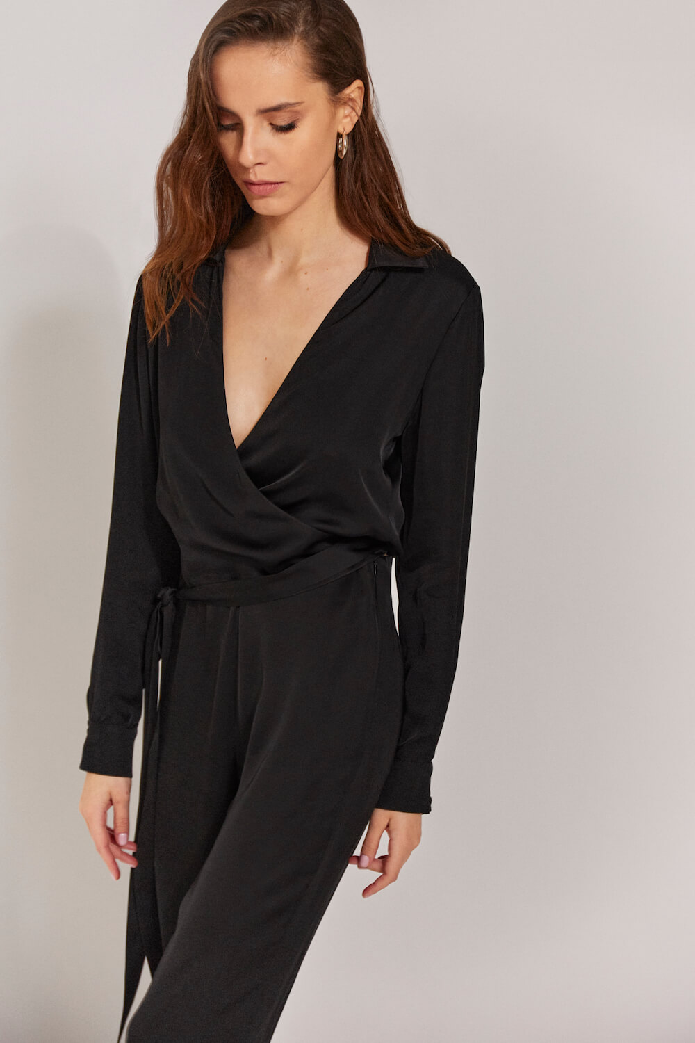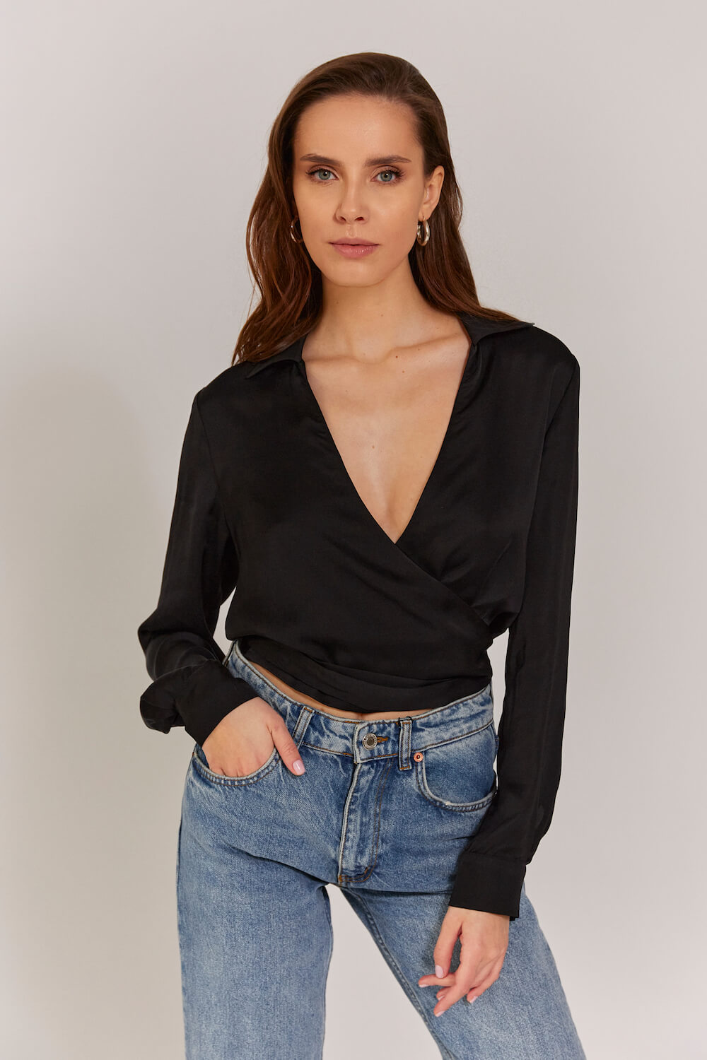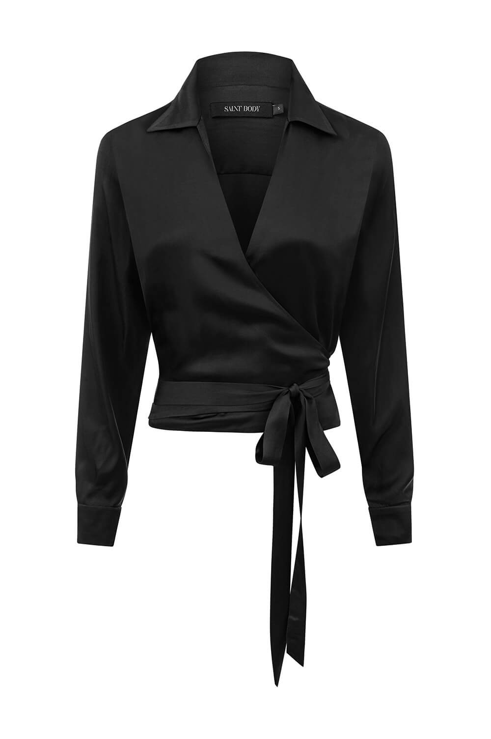 Damska, satynowa wiązana koszula z kołnierzykiem. Szerszy krój, który można dopasować do sylwetki dzięki wiązaniom wokół pasa. Czarna koszula to must have a szafie każdej kobiety.